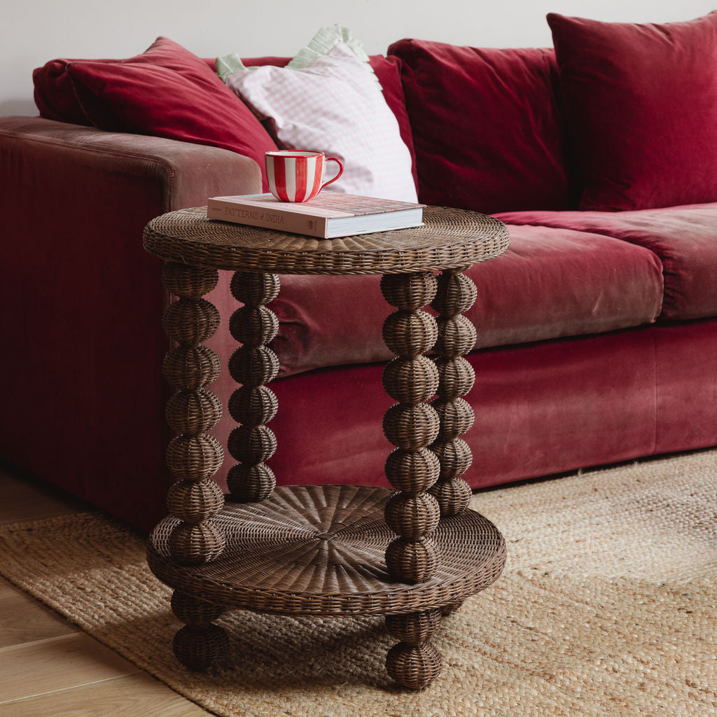 Wicker bobbin side table with a red mug and book in front of a red sofa.